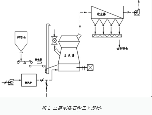 經破碎后的石灰石由庫底調速皮帶秤計量配料后,由皮帶輸送機喂入立磨進行粉磨,成品為細度250目石灰石粉。粉磨后的石灰石粉經輸送機送入成品庫儲存。儲庫庫頂設有單機收塵器除塵。