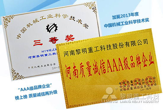 2014年年初,經(jīng)中國機械工業(yè)科學(xué)技術(shù)獎評審委員會評審和中國機械工業(yè)科學(xué)技術(shù)獎管理委員會批準(zhǔn),黎明重工憑MTW歐式梯形磨粉機(MTW歐版磨)折桂2013年度中國機械工業(yè)科學(xué)技術(shù)獎三等獎。中國機械工業(yè)科學(xué)技術(shù)獎,是目前國內(nèi)在機械行業(yè)中唯一由國家批準(zhǔn)的獎項,是中國機械制造行業(yè)的“諾貝爾”獎。