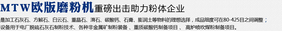 是加工石灰石、方解石、白云石、重晶石、滑石、碳酸鈣、石膏、膨潤土等物料的理想選擇,成品細度可在80-425目之間調整;設備用于電廠脫硫石灰石制粉技術、各種非金屬礦制粉設備、重質碳酸鈣制備項目、高爐噴吹煤粉制備項目。