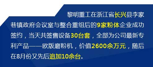 2012年3月20日,黎明重工與整合重組后的9家粉體企業成功簽約,當天共簽售歐版磨粉機30臺套,價值2600余萬元,隨后在8月又先后追加10余臺,基本囊括了所有粉體設備的訂單。